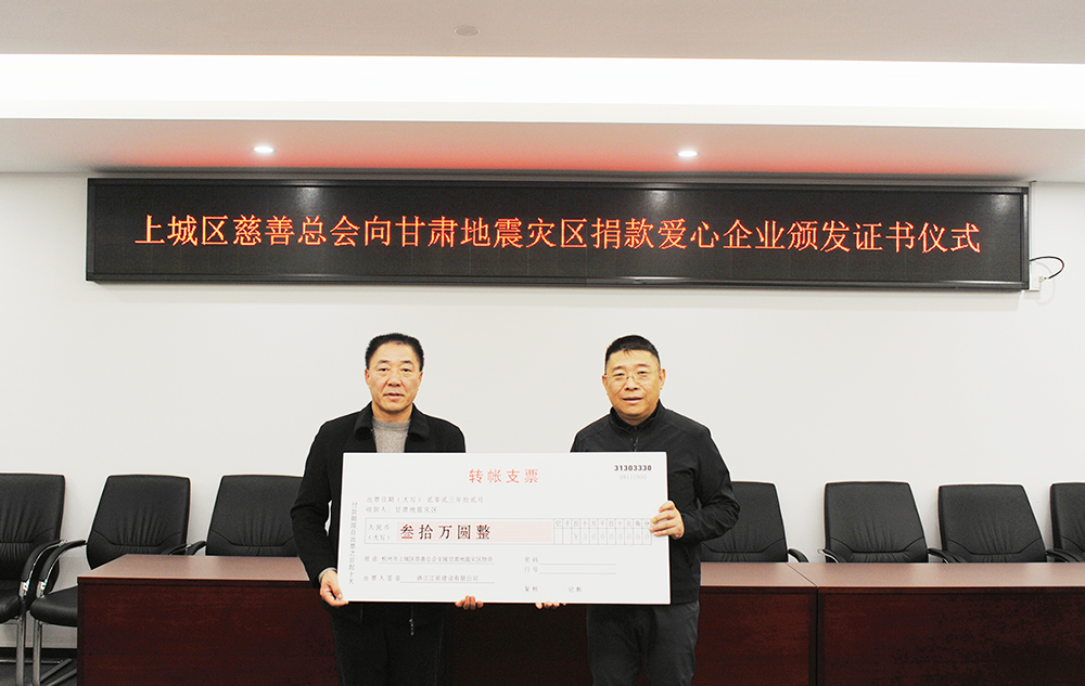 公司第一時間響應(yīng),經(jīng)杭州市上城區(qū)慈善總會向甘肅地震災(zāi)區(qū)捐款30萬元人民幣,支持災(zāi)區(qū)人民抗震救災(zāi)、共克時艱。