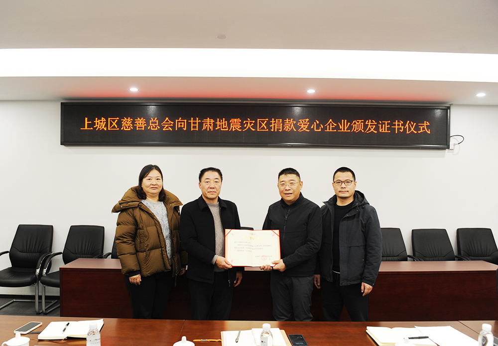 1月4日,上城區(qū)慈善總會向公司頒發(fā)證書,儀式上,慈善總會局長魏維對公司善行義舉表示崇高敬意和衷心感謝。并向公司介紹了慈善總會后期工作的開展,希望公司在力所能及的范圍內(nèi),繼續(xù)參與公益慈善事業(yè)。