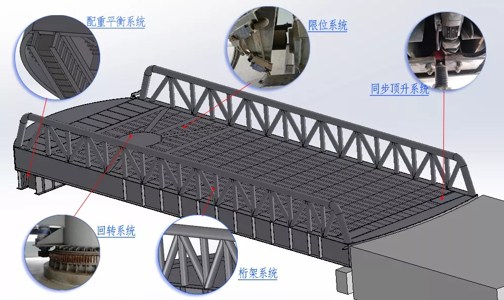為滿(mǎn)足通航、兩側(cè)堤防的公路交通及景觀要求,船閘交通橋梁創(chuàng)造性地采用配重式雙旋轉(zhuǎn)鋼結(jié)構(gòu)活動(dòng)公路橋。旋轉(zhuǎn)鋼橋按城市B級(jí)荷載設(shè)計(jì),可在8級(jí)臺(tái)風(fēng)以下旋轉(zhuǎn)運(yùn)行。