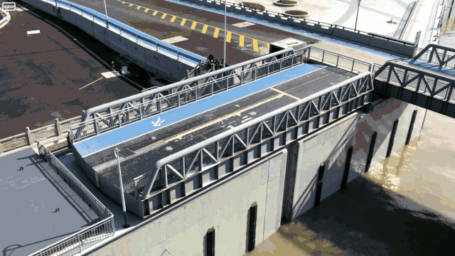項(xiàng)目水閘系統(tǒng)采用更適應(yīng)高泥沙、高潮浪水域及雙層雙向擋水閘門(mén)系統(tǒng)。船閘系統(tǒng)工作閘門(mén)采用與周邊環(huán)境更協(xié)調(diào)的底軸驅(qū)動(dòng)翻板閘門(mén),閘上不設(shè)置上部建筑物,為目前底軸直徑國(guó)內(nèi)最大、擋水水頭最高的船閘底軸翻板閘門(mén)。翻板閘門(mén)滿(mǎn)足雙向擋水及7級(jí)臺(tái)風(fēng)下通航運(yùn)行要求。